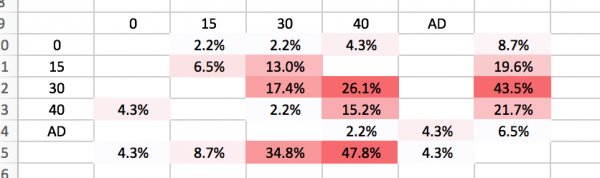 When you look at Nadal, he takes ages to serve. But sometimes much longer than others. The most number of violations occurred when he was 30-40 down and facing a break point. But generally at something-40 to his opponent, he took much longer than at other score lines. If this was deliberate then we should see a sliding scale on less important score lines. That is exacly what we saw.